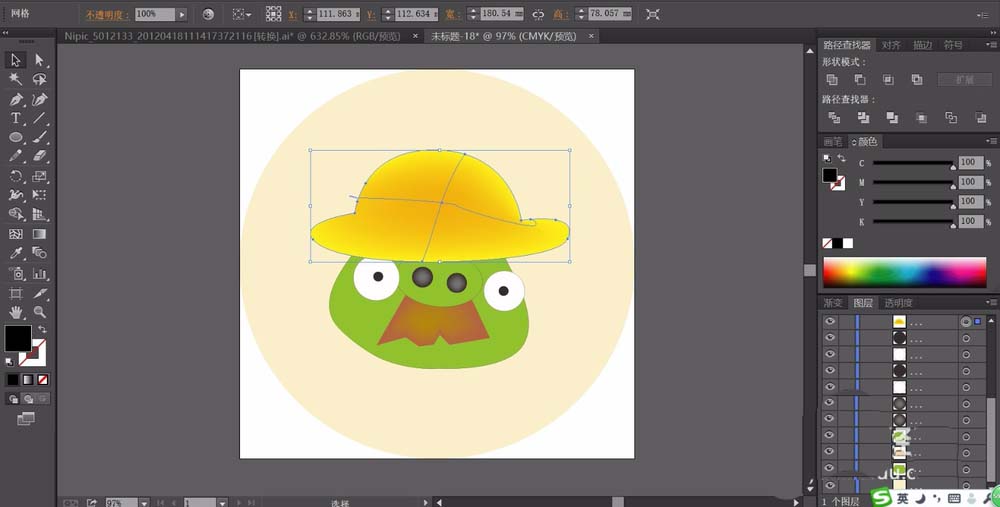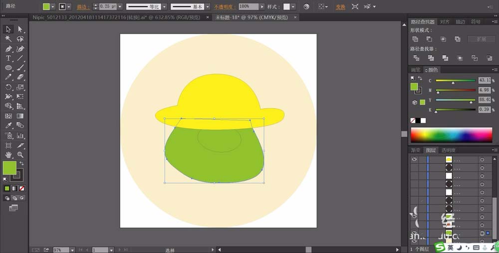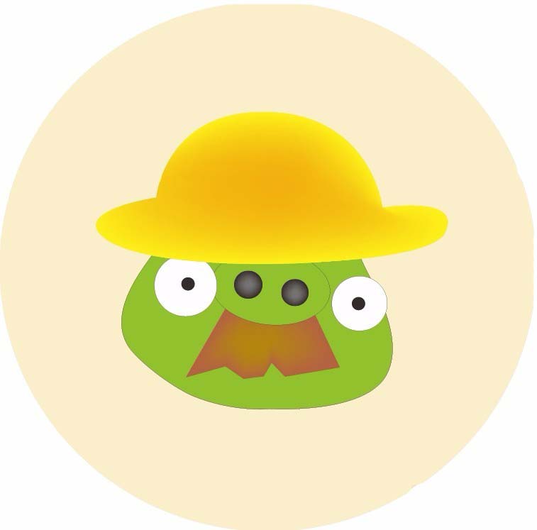 2、再用钢笔画出猪猪的小帽子的路径,还有圆形脸的路径,我们分别填充帽子为黄色,脸蛋为绿色。