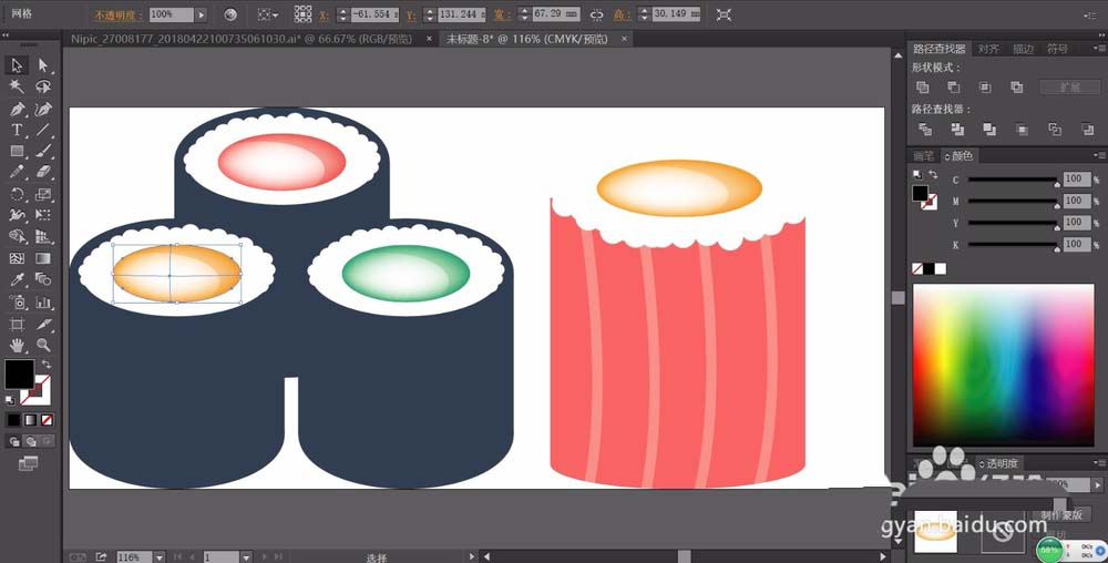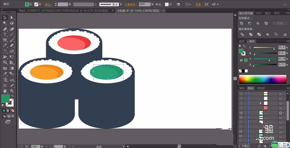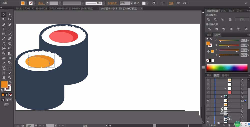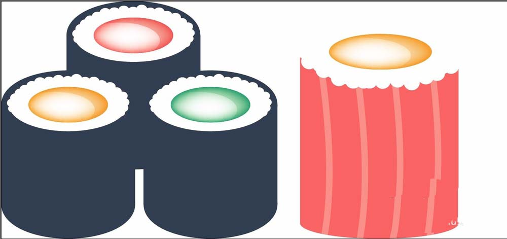 5、复制整个寿司后放到左侧的下方,我们改变一下寿司顶端的小的圆形的色彩,用橙色与橙黄色来填充填充主体与暗边。接着,再做一次,我们用不同明度的绿色填充寿司顶端的小的圆形与暗边。