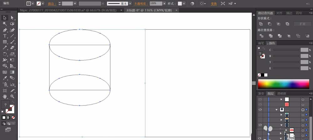 1、先用圆形与矩形画出这个寿司所在的圆柱形状,我们让两个圆形竖直方向对齐。