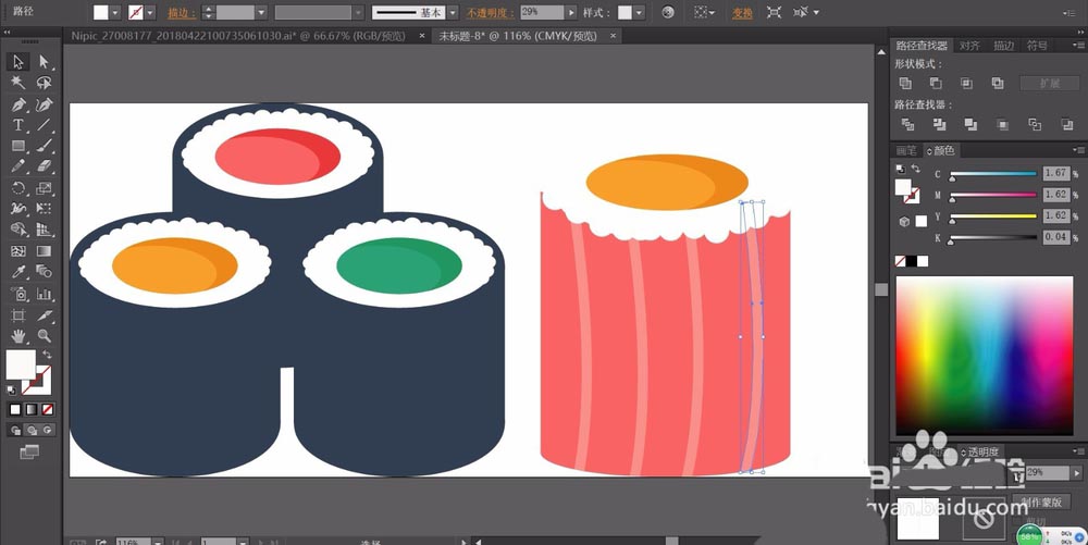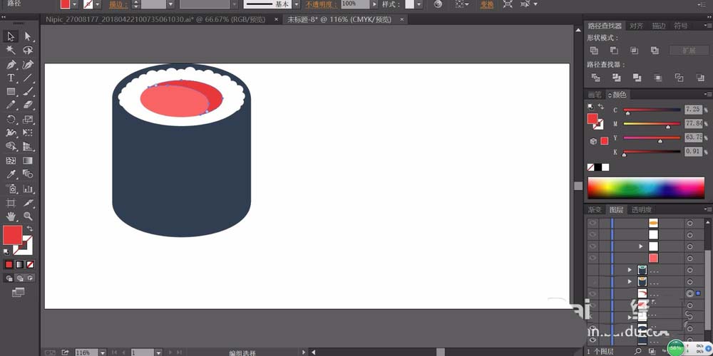 6、这一步,我们继续复制出一个大的寿司,用粉红色填充寿司的正面路径,再用半透明的效果设置一下正面的竖条,竖条本身用白色填充。