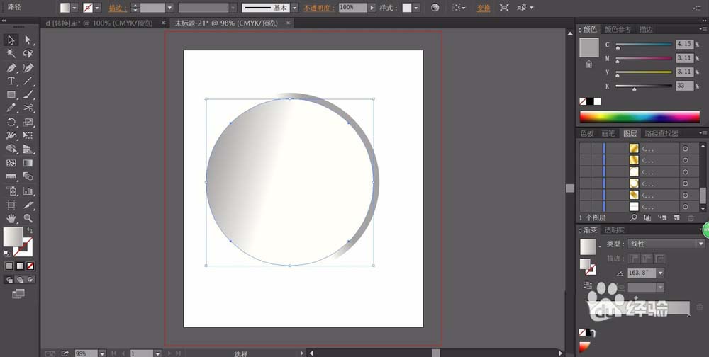 2、使用圆形工具画出这个指南针的大的边缘圆形,我们用金色的渐变填充。