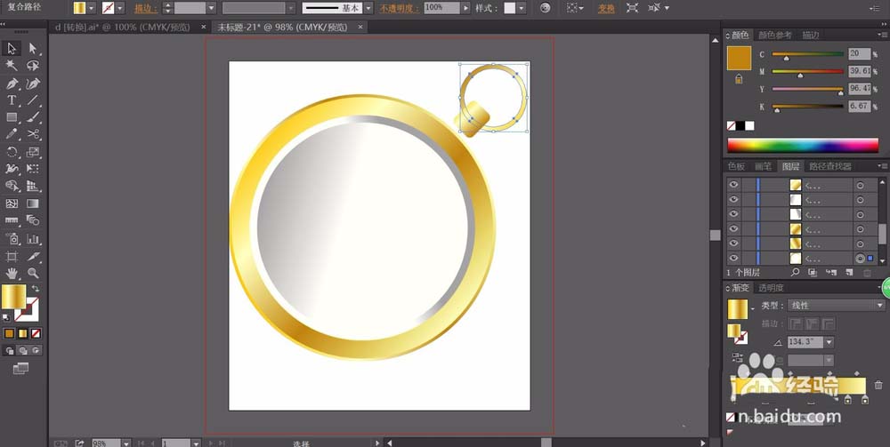 3、继续使用矩形与圆形工具画出指南针的顶端拉手所在的圆环与结构件,我们也用金色的渐变填充。
