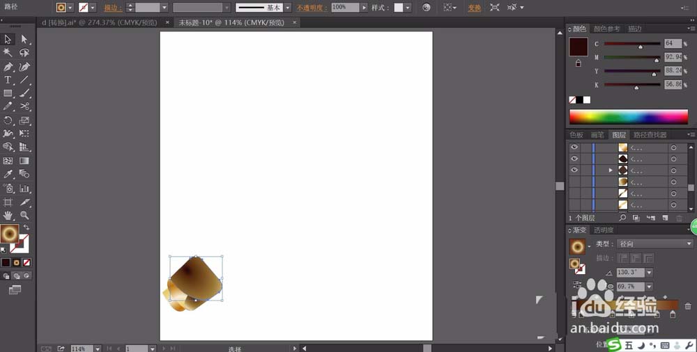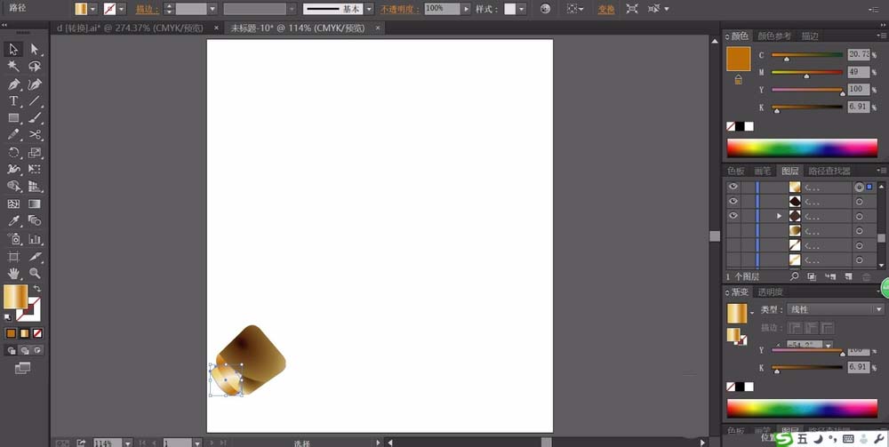 3、我们用金色的渐变填充左侧面,用暗金色的渐变填充这个笔夹的右侧面。