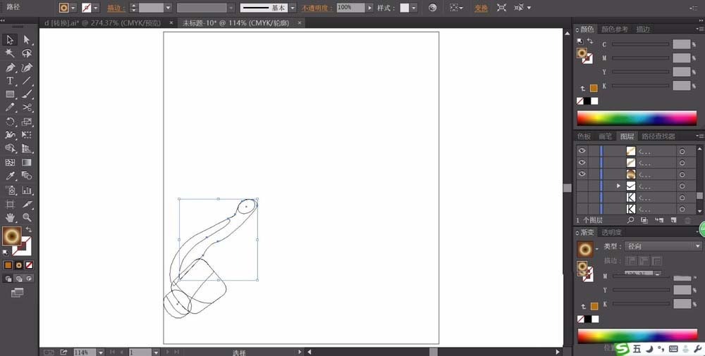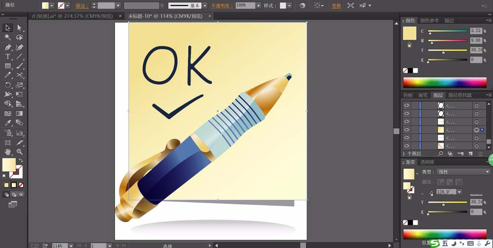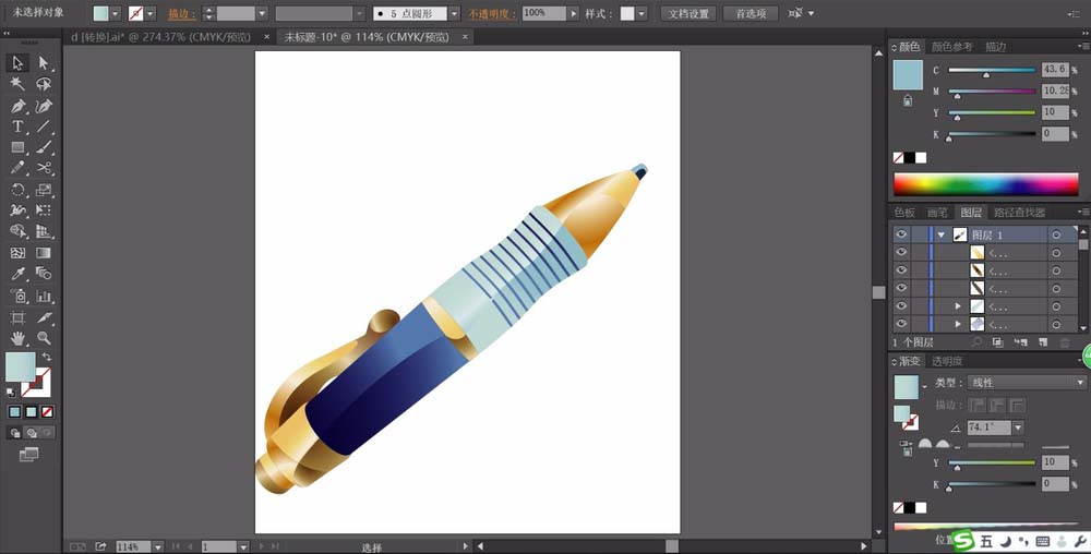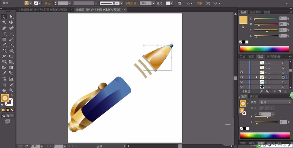 5、复制这个笔头的路径,我们缩小到96%之后再用金色的渐变填充,画出笔尖的部分路径,我们用蓝色的渐变填充。