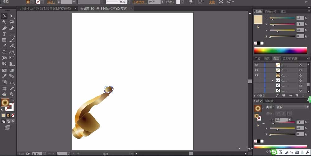 1、先用钢笔画出这个笔的按钮的路径,包括高光的细节路径,我们用暗金色的渐变填充末端,用金色的渐变填充按钮。