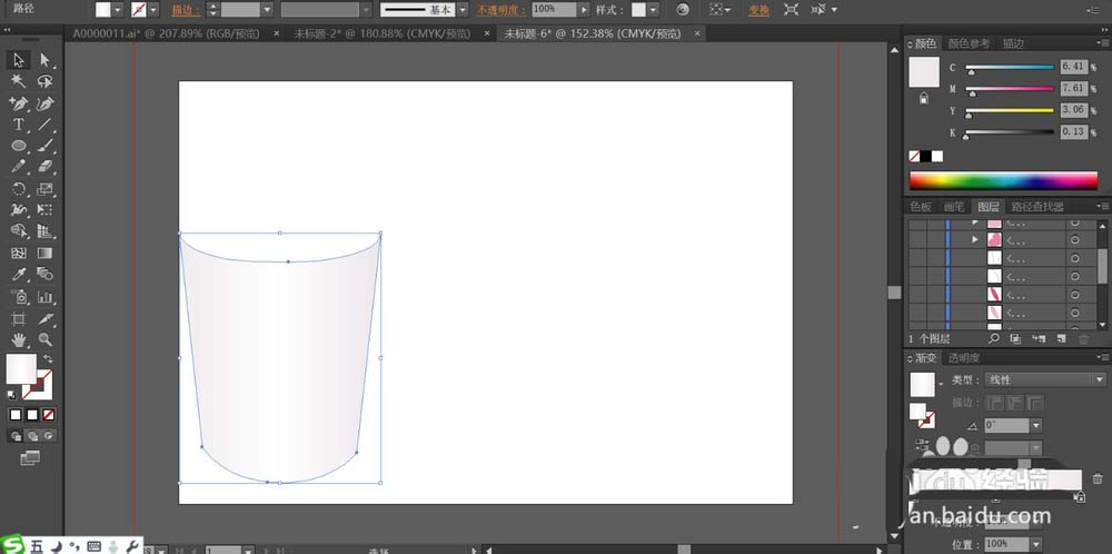 1、使用钢笔画出筒子的正面路径,我们用灰色的渐变填充,让高光出现在中间区域。