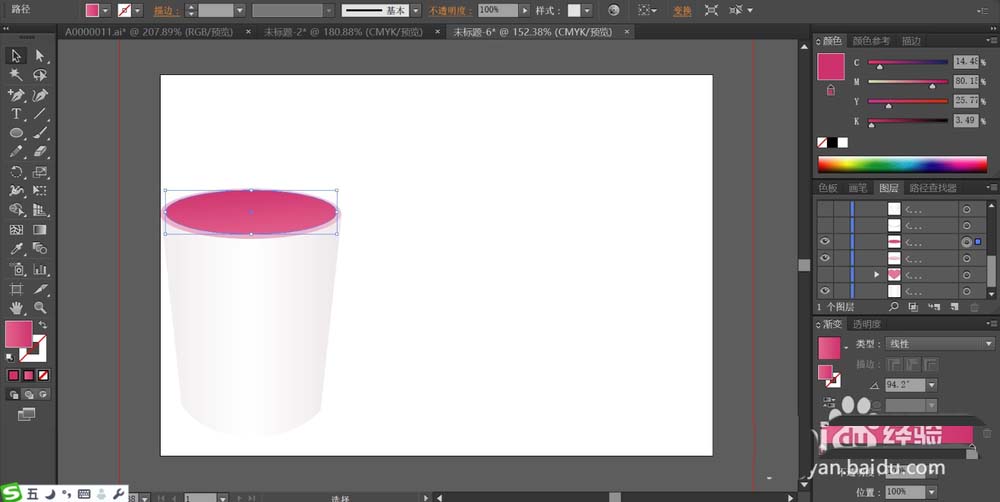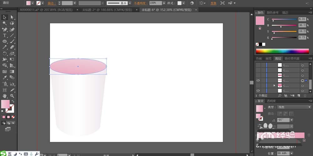 2、使用圆形工具画出筒子的顶端的圆形,我们用淡粉红色的渐变填充。