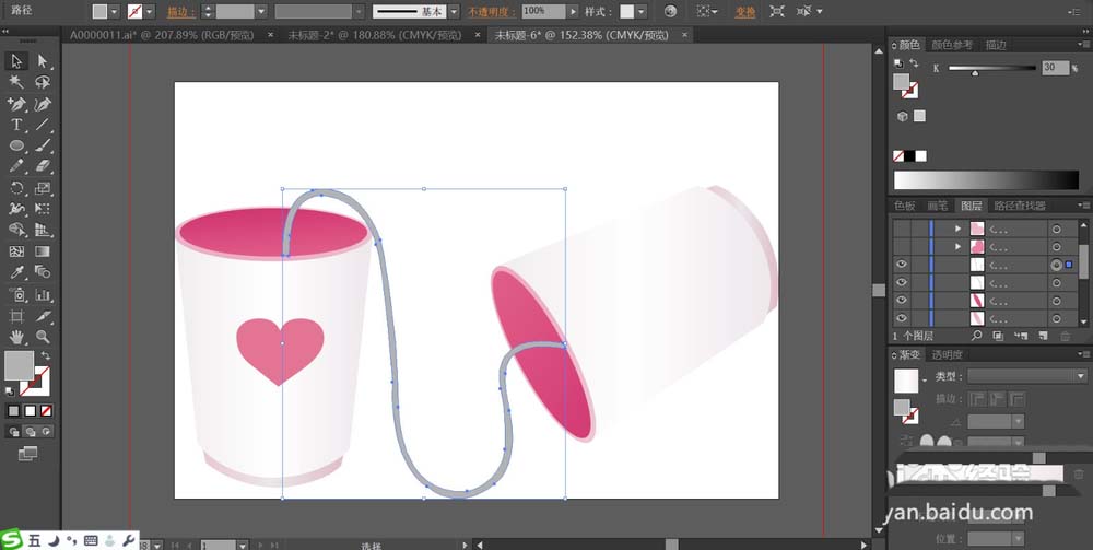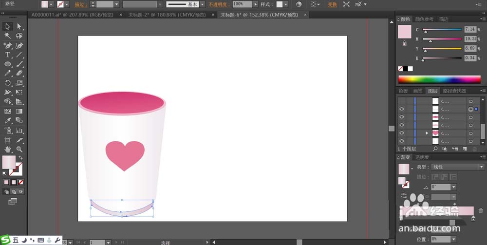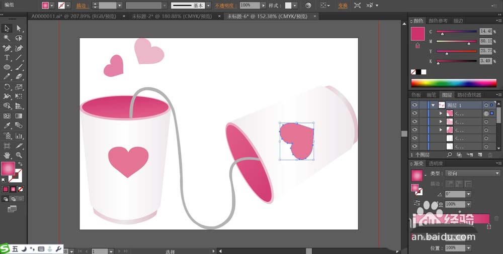 4、使用心形工具在筒子的正面画出一个心形,我们用粉色的渐变填充这个心形。