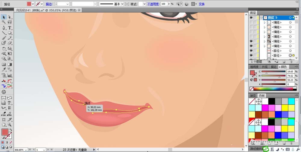 4、画出女人的嘴唇路径,我们用三种不同的粉红色填充嘴巴的细节层次路径,嘴唇中间用暗红色填充。