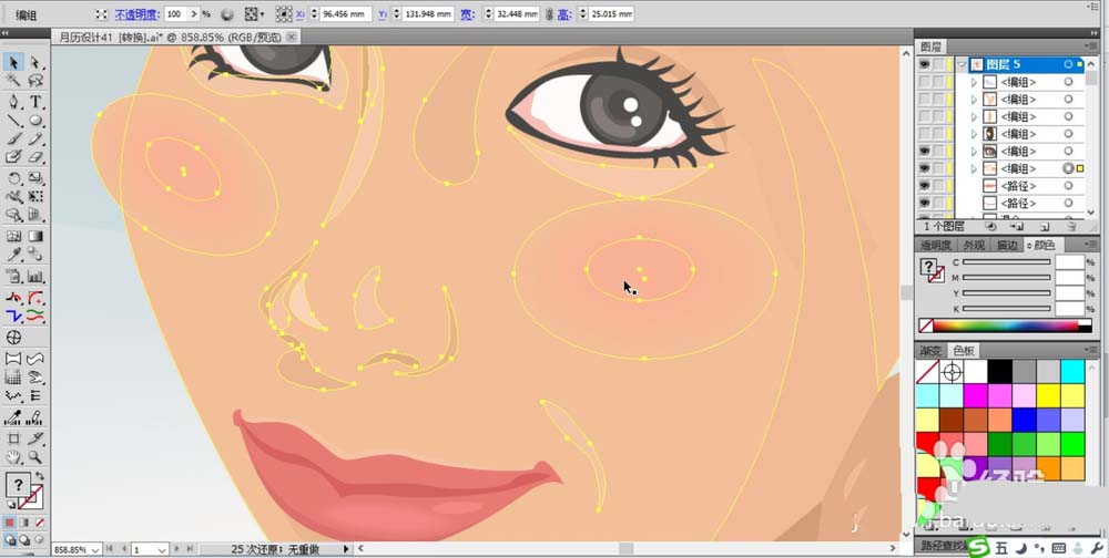 5、女人的鼻子也用亮度不同的粉色来呈现暗区与亮区,而脸晕用网格技巧呈现渐变的粉红色。