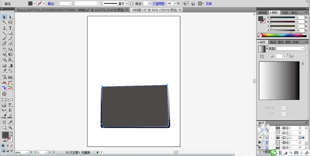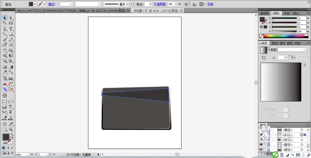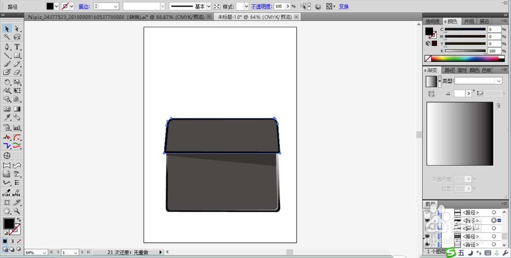 1、先用钢笔画出一个四边形,这就是黑皮包的主体路径,我们填充灰白色,再描绘出黑皮包的边缘,我们用黑色的渐变填充。