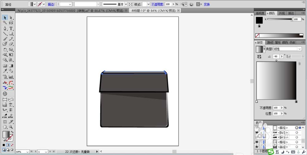 3、使用钢笔工具画出黑皮包上部的亮区,我们用黑色的渐变填充。