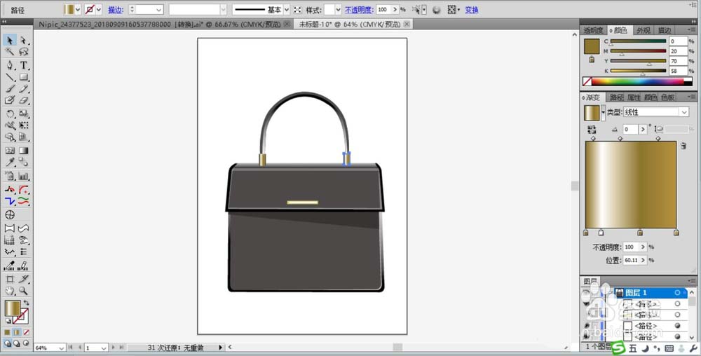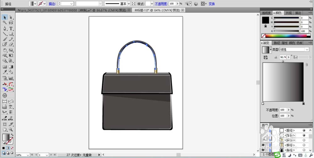 7、使用圆形工具切割出包包的半圆形拎手,我们用黑色来填充,继续描绘出拎手的亮区,我们用灰白色的渐变填充。在拎手的下部画出圆形的金属扣,我们用金色的渐变填充,画出一个金属扣再复制出另外的一个。在翻盖上画出一个四边形作为黑皮包的装饰,填充金色,黑皮包产品设计完成。