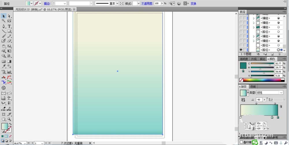 1、选择青色、米黄色,我们设置一个三色的渐变来填充一个矩形作为背景水面。