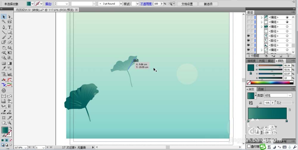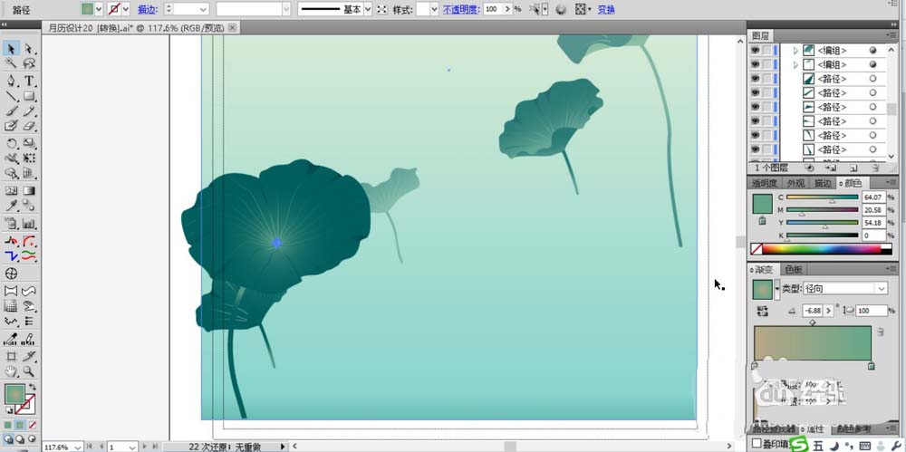 2、在画面的左侧下方画出一个荷叶的造型,我们用青色的渐变填充,在荷花的中心用淡青色画出根径。有了一个荷叶再复制出另外的一个荷叶并调整一下大小与透明度,从而形成一种远近不同的效果。