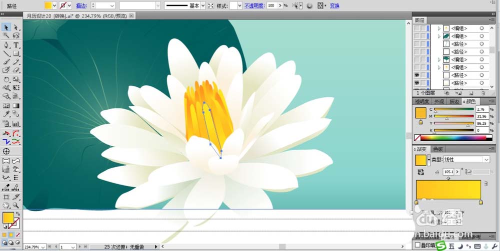 4、使用钢笔工具画出荷花的基本轮廓,我们用灰白色的渐变填充花瓣,用黄色的渐变填充花蕊。
