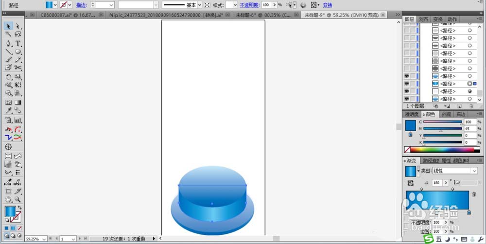 2、复制椭圆并填充半透明的白色放在上方,继续使用圆形工具绘制出更小的圆形并填充蓝色的渐变,下方使用钢笔工具绘制出圆弧作为侧面,并填充一个三色蓝的渐变。