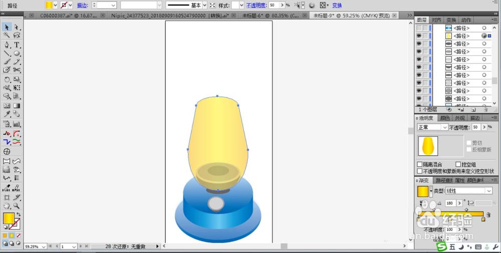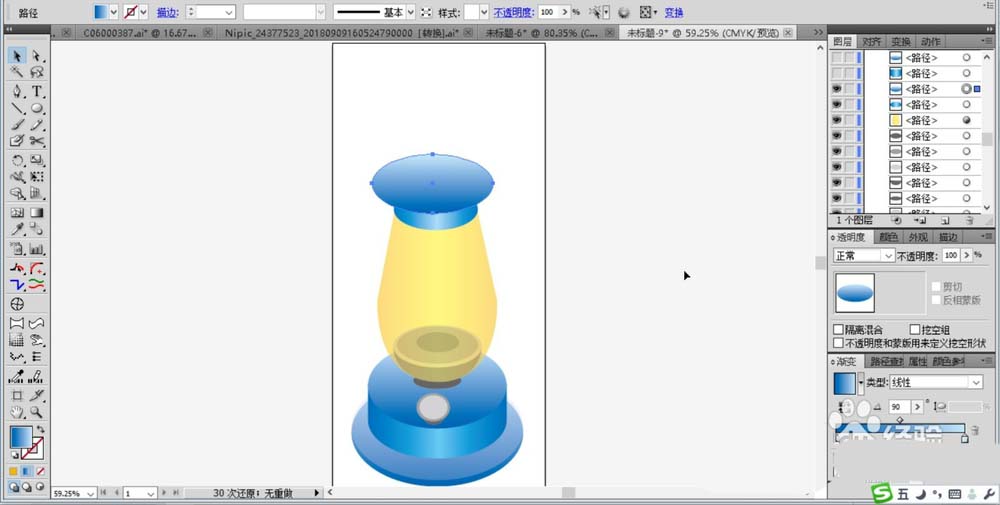 4、在底座的上方我们使用钢笔工具绘制出一个圆形的灯管并填充为黄色的渐变,设置成半透明的效果。