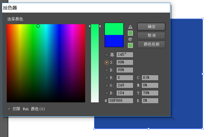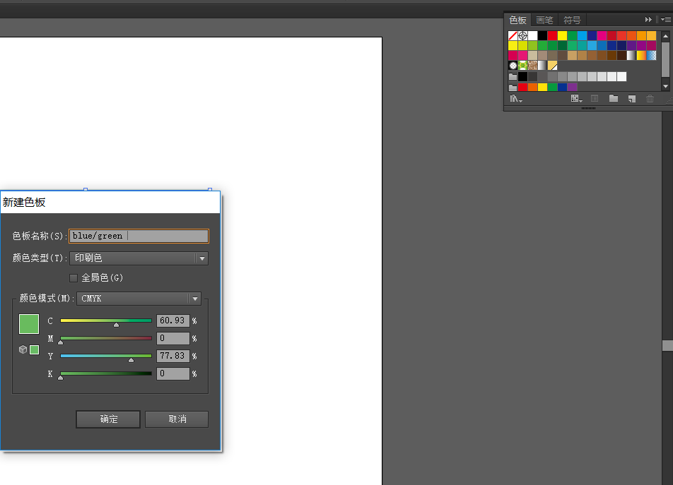 1、使用拾色器创建颜色blue/green并将其存储在色板中,然后选中“全局色”复选框,则此颜色作为色板出现色板面板中