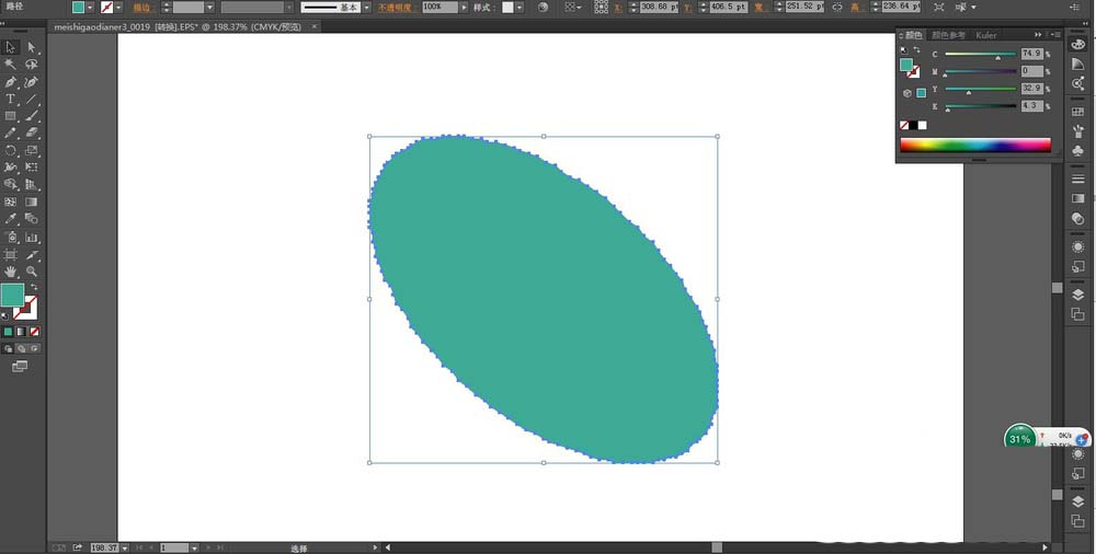 1、先选择圆形工具,我们画出一个椭圆再旋转30度左右,填充椭圆为绿色,我们给这个椭圆做一下扭曲的滤镜,让其边缘比较粗糙。