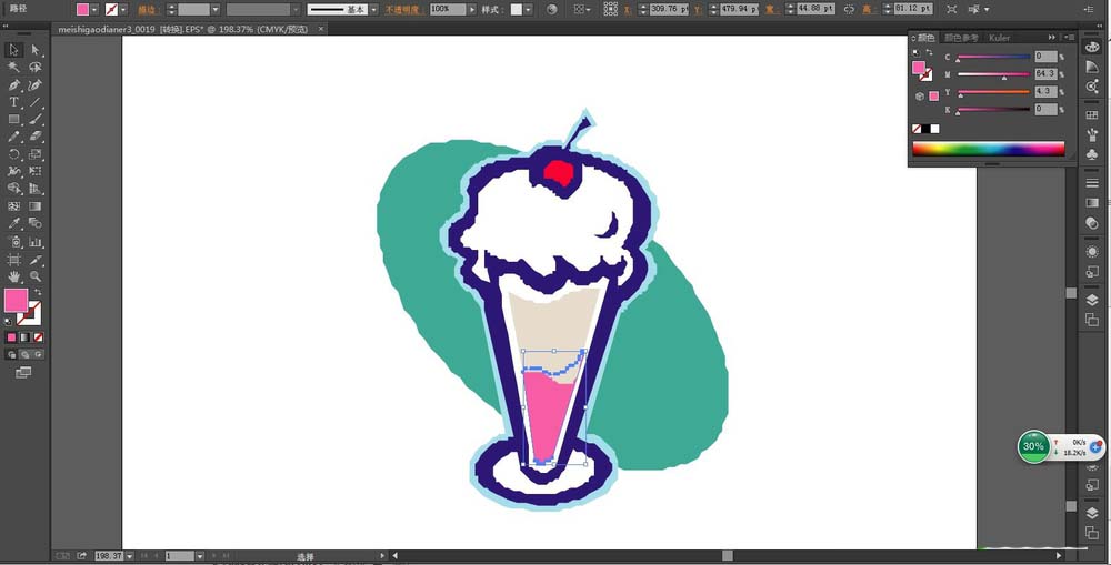 4、我们再绘制出玻璃杯当中的饮品的细节元素路径,我们用粉红色填充下方的路径,用灰白色填充上方的路径。