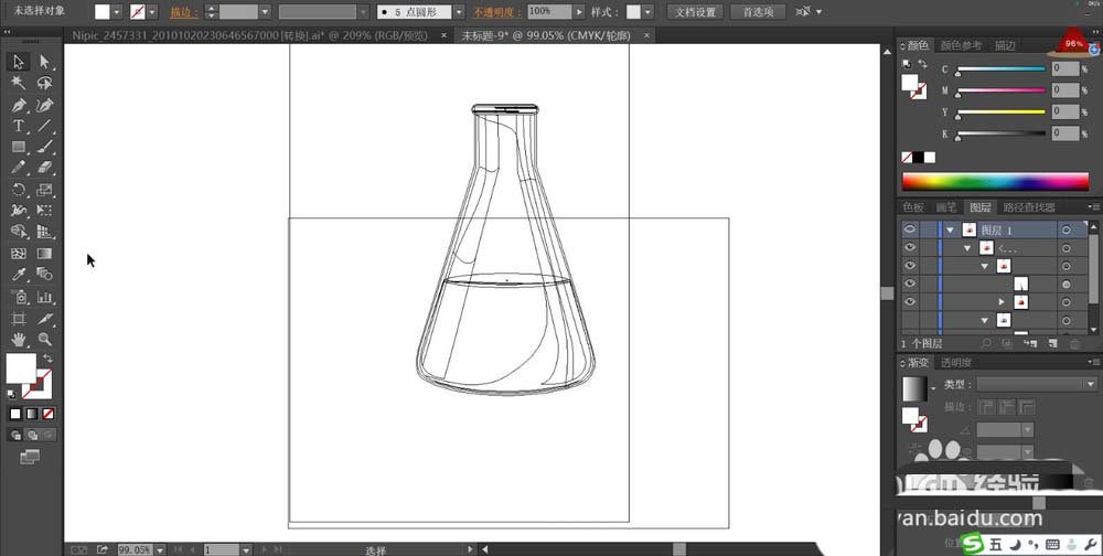 1、先用钢笔勾勒出大烧瓶的基本轮廓,还有烧瓶的表面的高光与暗光区域的路径。