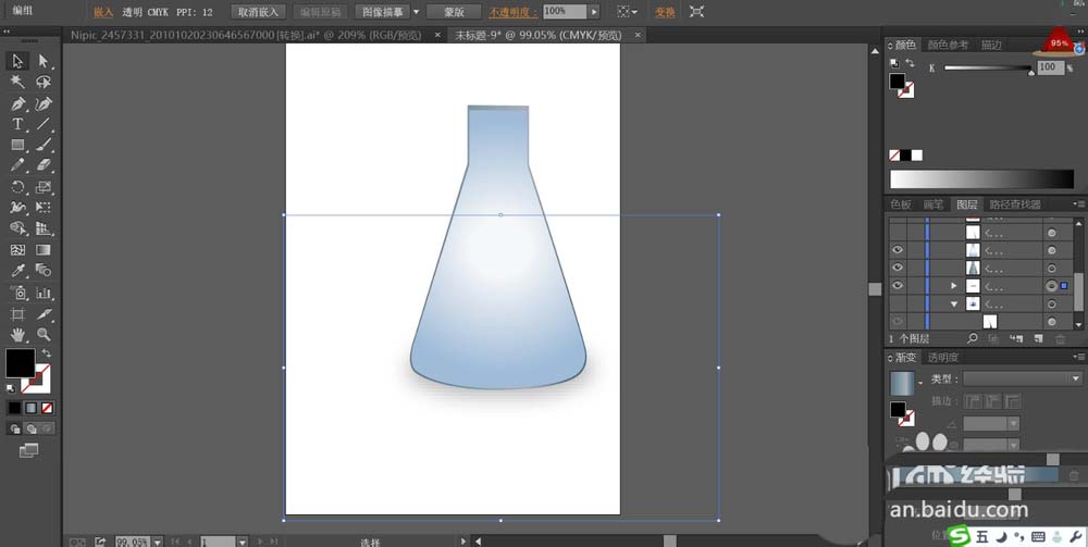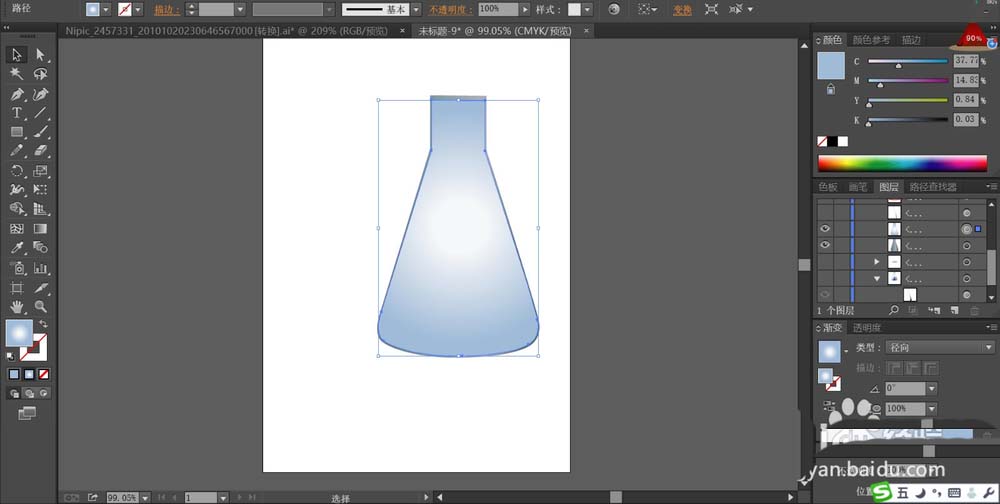 2、我们用淡蓝色的渐变填充这个烧瓶的基本路径。