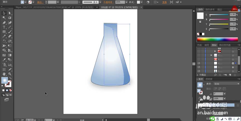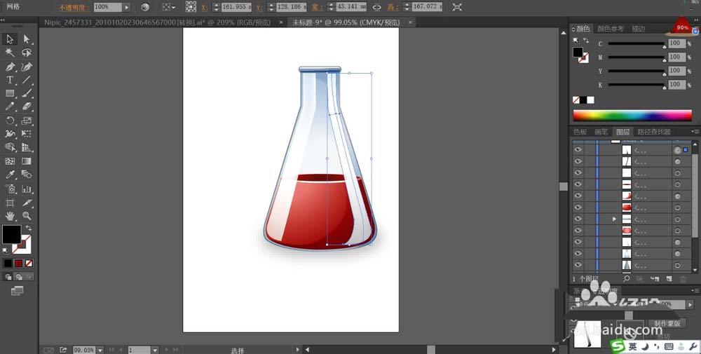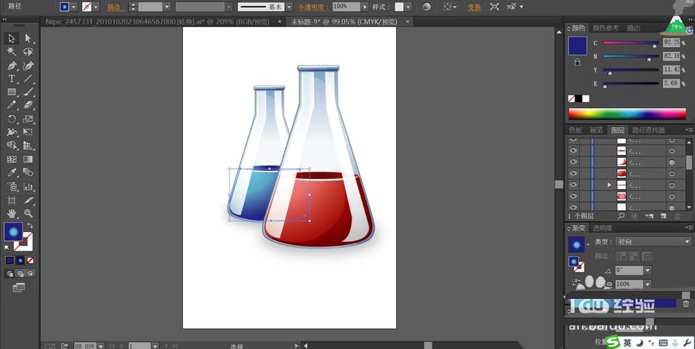 5、重点绘制蓝色的烧瓶内的红色的液体的正面、侧面、顶端三个路径,我们用不同的红色的渐变填充这三个路径,让液体的细节呈现出效果。