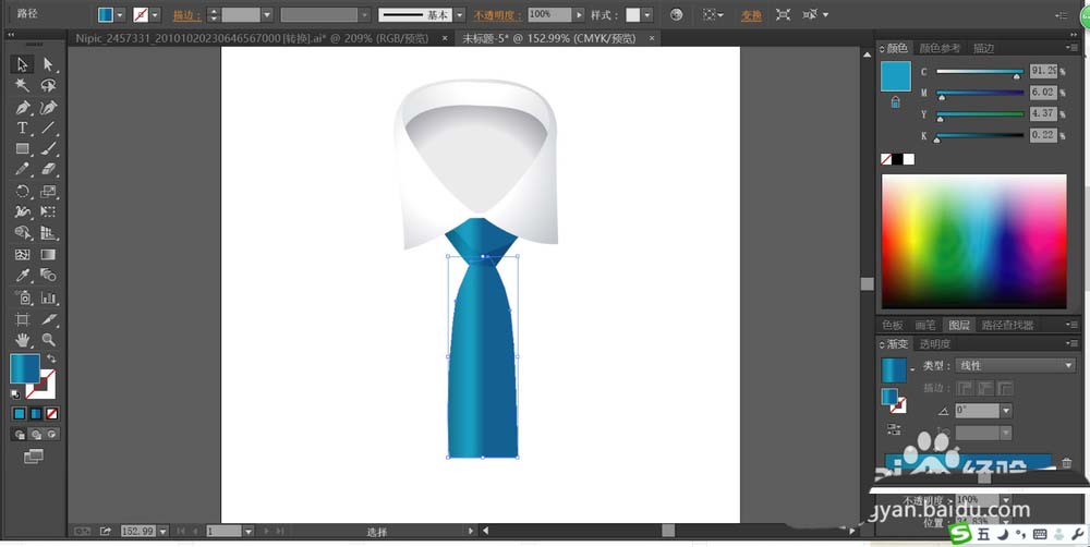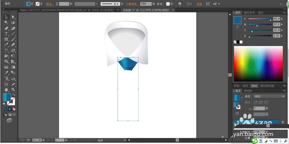 4、再继续画出领带的下方部分,我们用蓝色的渐变填充领带的下半部分。