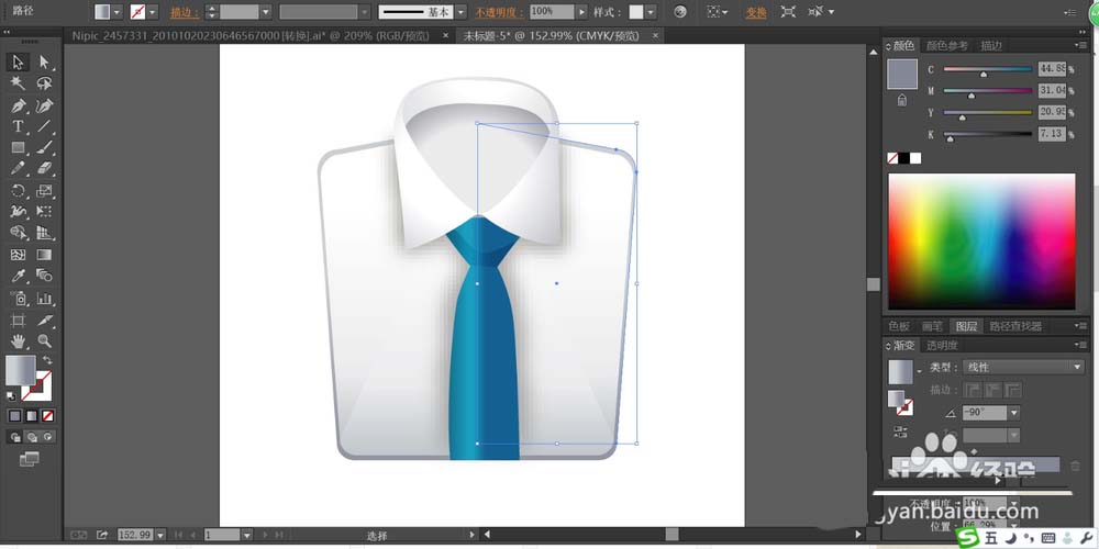 1、先用钢笔描绘出衬衫的领口与内衬的基本路径,我们用灰白色的渐变与灰黑色的渐变填充。
