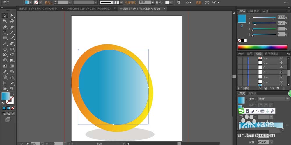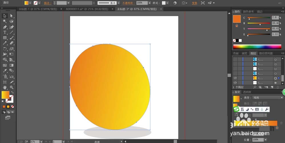 1、先用圆形工具画出飞镖的表面路径,我们用橙色的渐变填充这个飞镖的路径,再用圆形工具画出这个飞镖的阴影,我们用半透明的灰色填充。