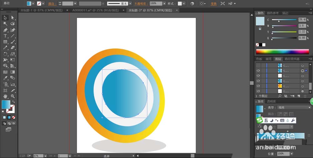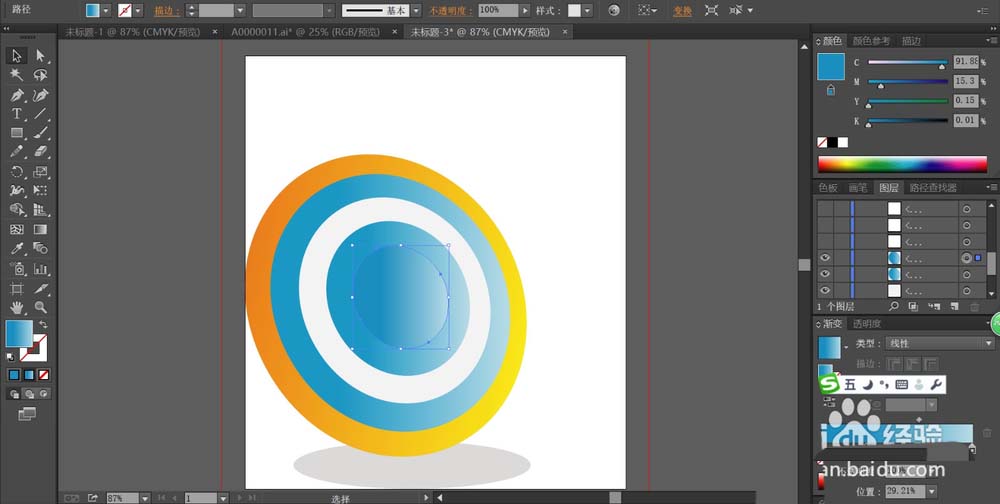 3、继续复制再缩小画出白色的内圈,再复制填充一个蓝色的渐变成为这个靶心的内圈的核心。