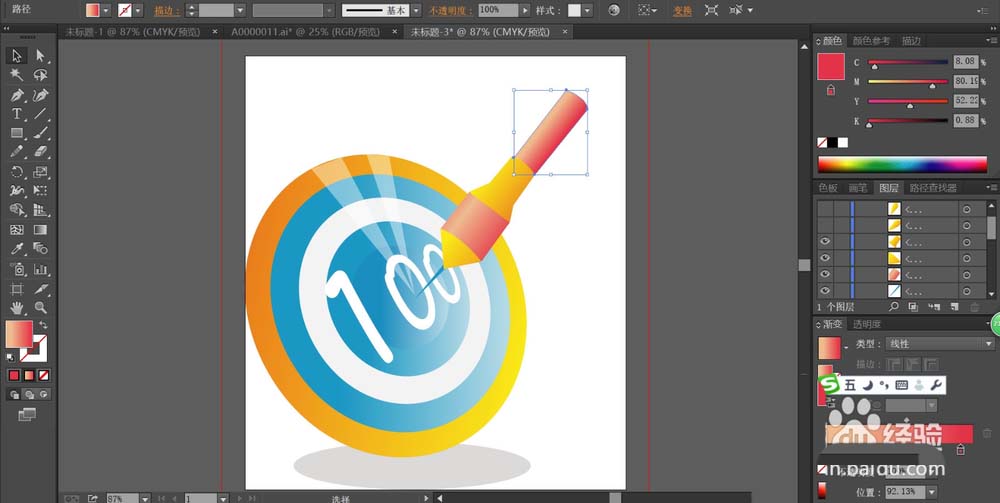6、这一步开始画出一个飞镖,我们用橙红色与橙黄色的渐变交替填充,从而完成这个飞镖的路径绘制与色彩填充。