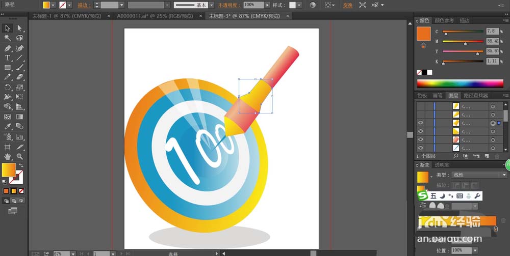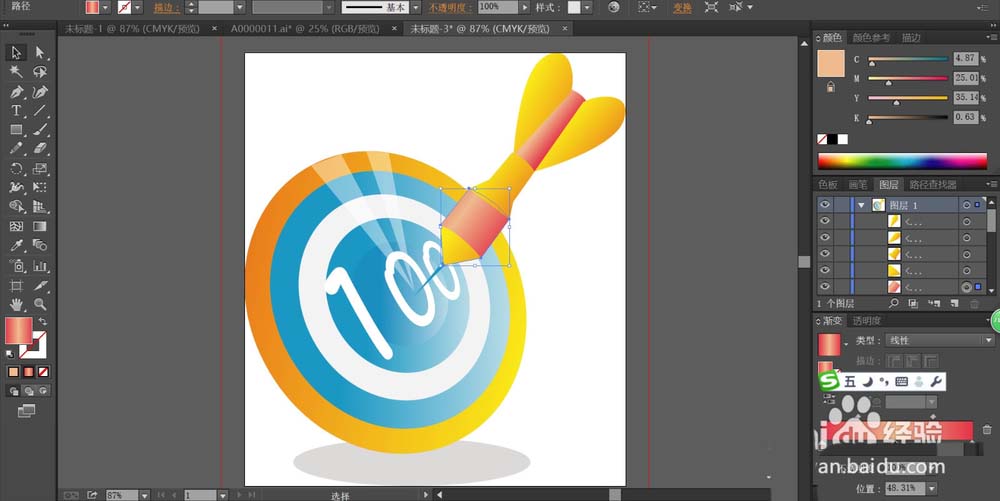 7、最后,我们再用钢笔画出这个飞镖的尾翼的路径,我们用橙黄色的渐变填充这个尾翼,完成飞镖图片设计。