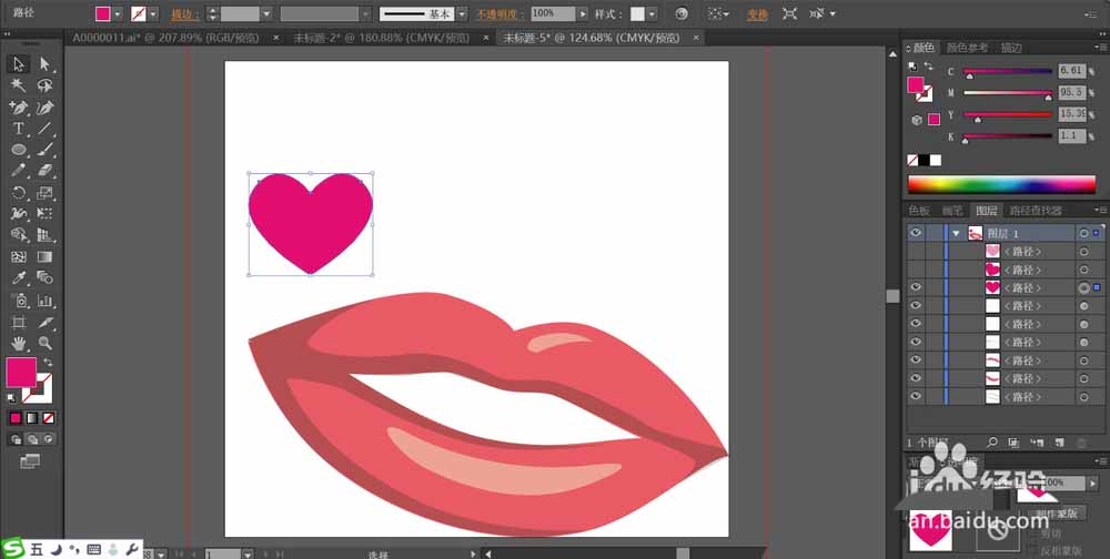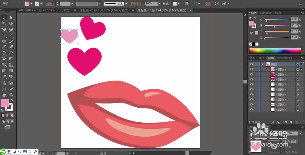6、再画出更多的小心形,分别用粉红色与桃红色来填充,完成嘴巴图片设计。