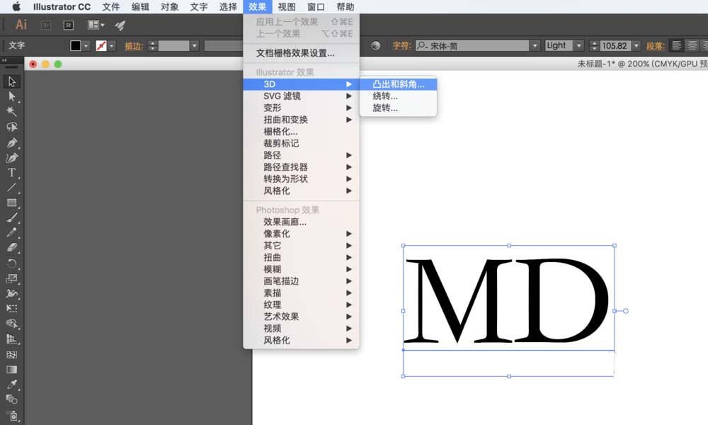 6、在工具栏上选择文本工具,在画布中打出要做特效的文字或字母,在菜单栏中找到“效果”-3D-凸出和斜角,设置好参数后文字就会变成3D效果了,如果黑色3D显示效果不明显,可以选一个明显的颜色。
