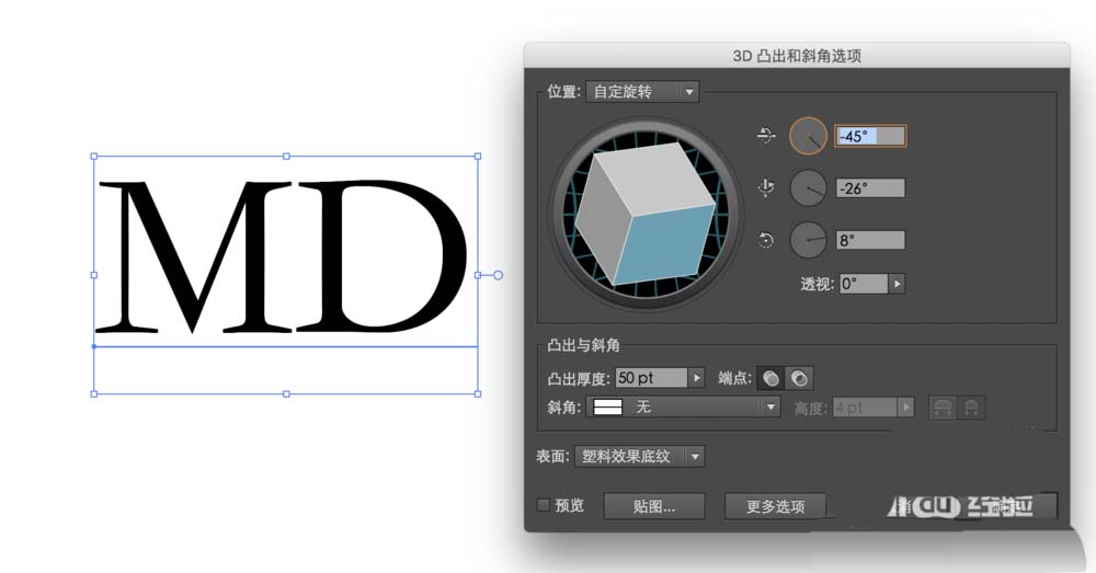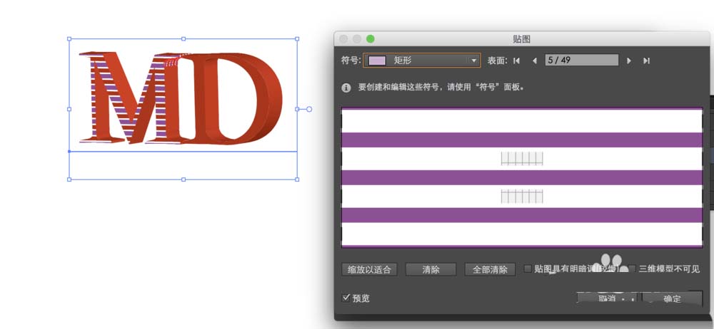 7、在凸出和斜角面板中,勾选左下角的“预览”,可以实时看到参数设置的效果,点击贴图,在贴图面板可以看到字体的每个面,在符号下拉中可以选择刚刚创建的矩形符号。