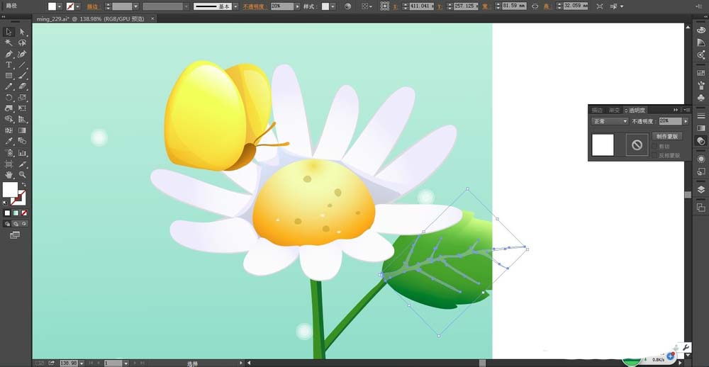 7、叶上面的茎杆用半透明的白色填充,大的叶子用网格工具做出立体感觉的渐变效果。
