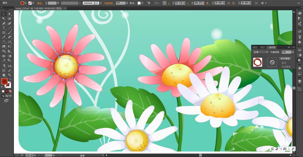 8、用红白色的渐变填充红色的花朵的花瓣,并用半透明的设置让花瓣的层次更加的丰富一些,不断的复制花朵到更多的位置,让众多花朵盛开的场景呈现出来,完成菊花蝴蝶风景画设计。