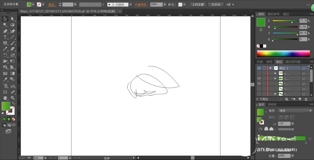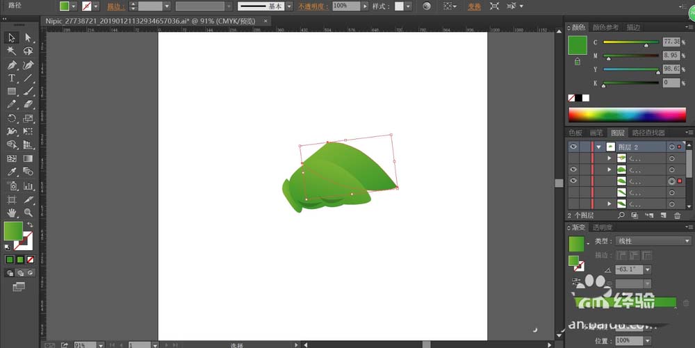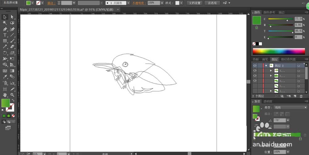 2、我们用绿色的渐变填充翅膀所在的路径,两只翅膀的绿色渐变稍稍改变一下明度。