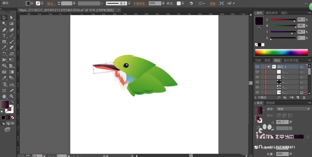 6、用绿色的渐变填充鸟儿的尾巴的路径,暗光区域用正片叠底的灰黑色填充,再设置一下半透明的效果,从而呈现出暗光的感觉。