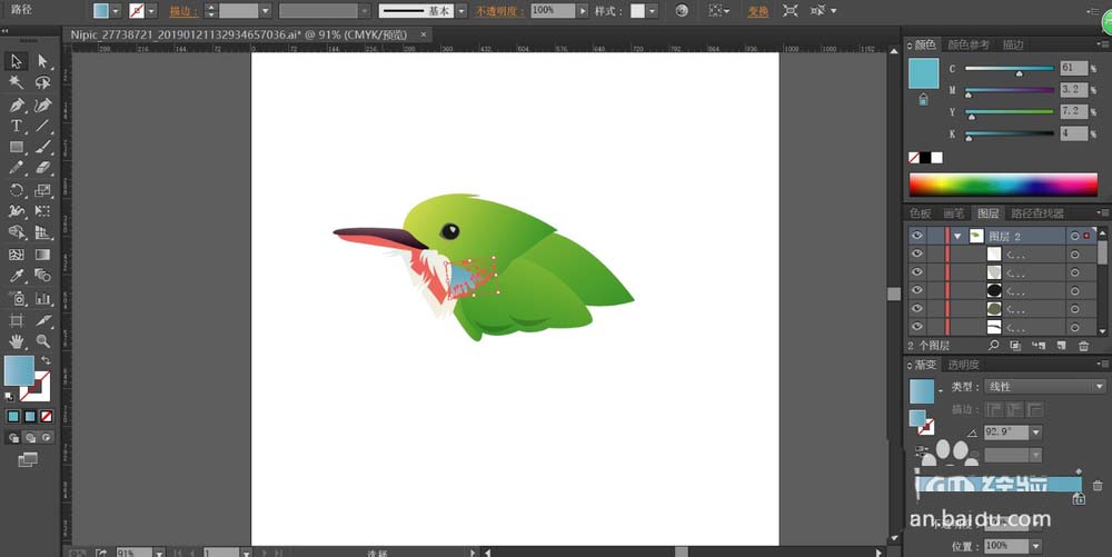 5、这一步,我们重点对于鸟儿的脖子区域的羽毛进行填色,使用蓝色的渐变、灰白色的渐变、粉红色的渐变搭配填充脖子区域的羽毛路径。