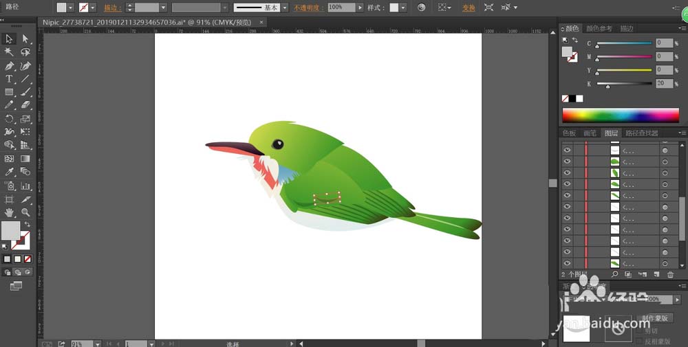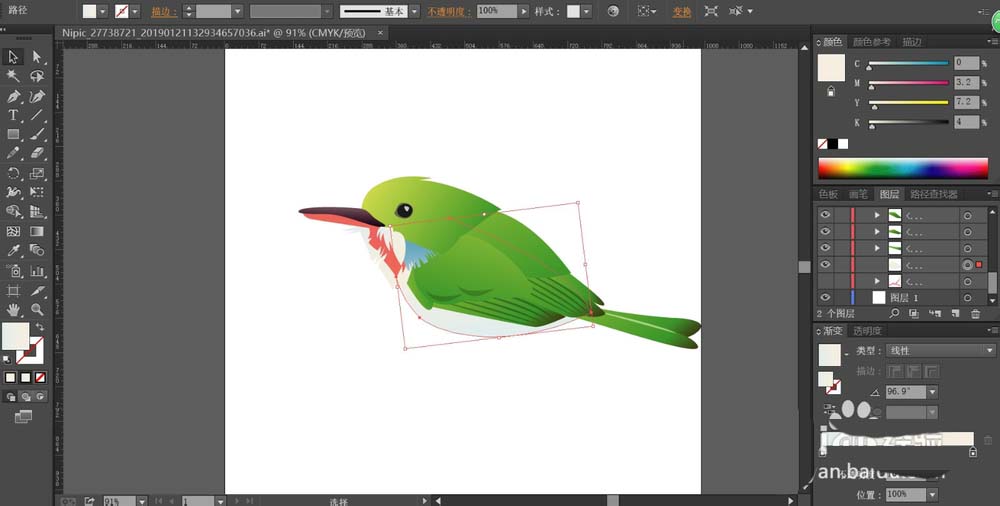 7、最后,我们用淡粉红色的渐变填充鸟儿的双脚所在的路径,完成小鸟图片设计。
