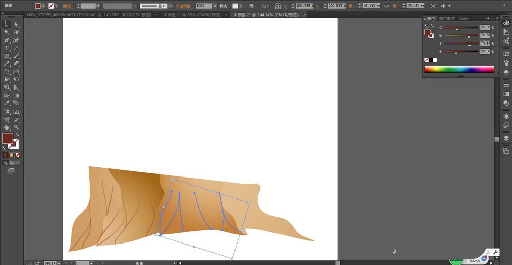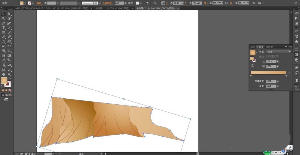 1、先用钢笔勾勒出小岛的基本轮廓路径,我们用棕色的渐变填充,不同的地块用不同的棕色的渐变,让土地的色调有所变化。