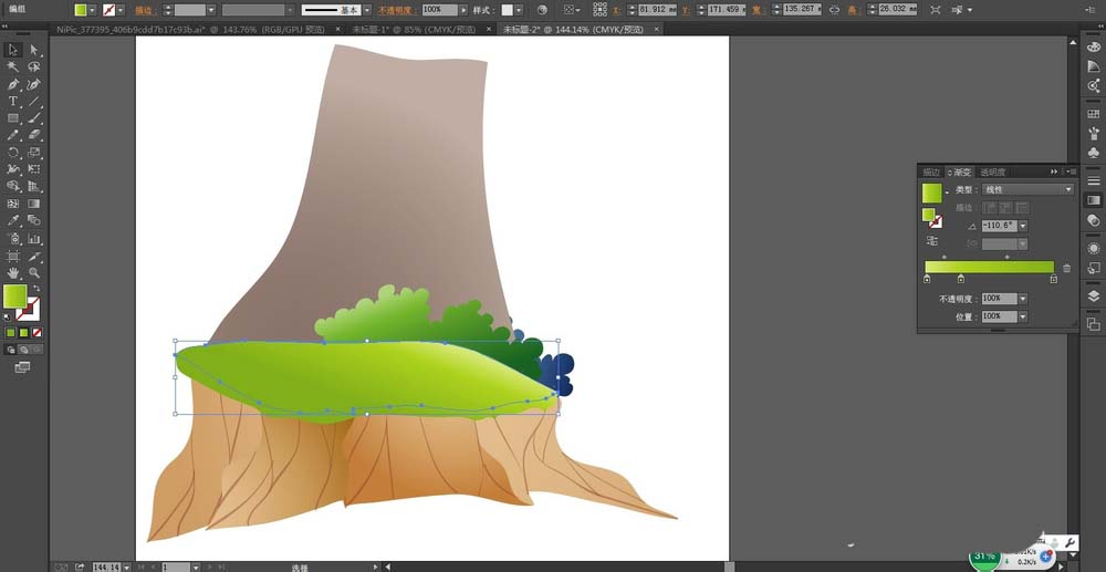 3、继续用钢笔勾勒出草地的轮廓,我们用绿色的渐变填充草地,再用深绿色的渐变勾勒出植被的路径。接着,我们画出远处的高山的轮廓路径,我们用棕灰色的渐变填充。