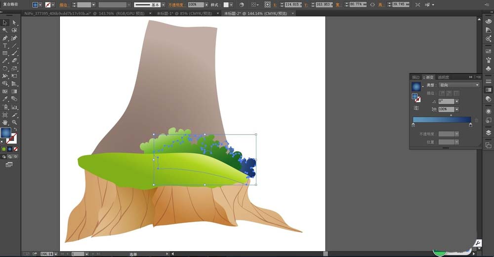 4、继续画出远处植被的基本轮廓,我们用蓝色的渐变填充。远处的植被放在近处的植被的后方区域。