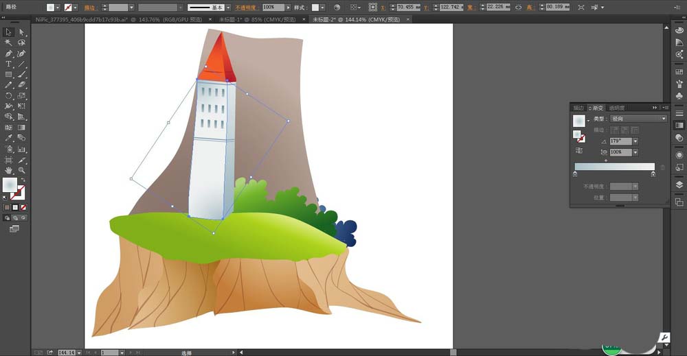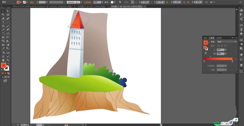 5、这一步,我们用钢笔画出高楼的基本轮廓,我们用灰白色的渐变与红色的渐变分别填充楼顶与楼层,再用青色的渐变填充楼房上的窗户的路径。