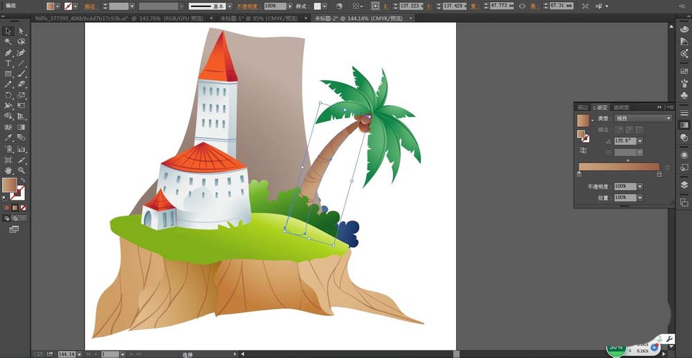 7、接着,我们用钢笔画出一棵椰子树在图片的右侧,树杆用棕色的渐变填充,绿色的渐变填充绿叶,叶片上的茎杆用深绿色填充。