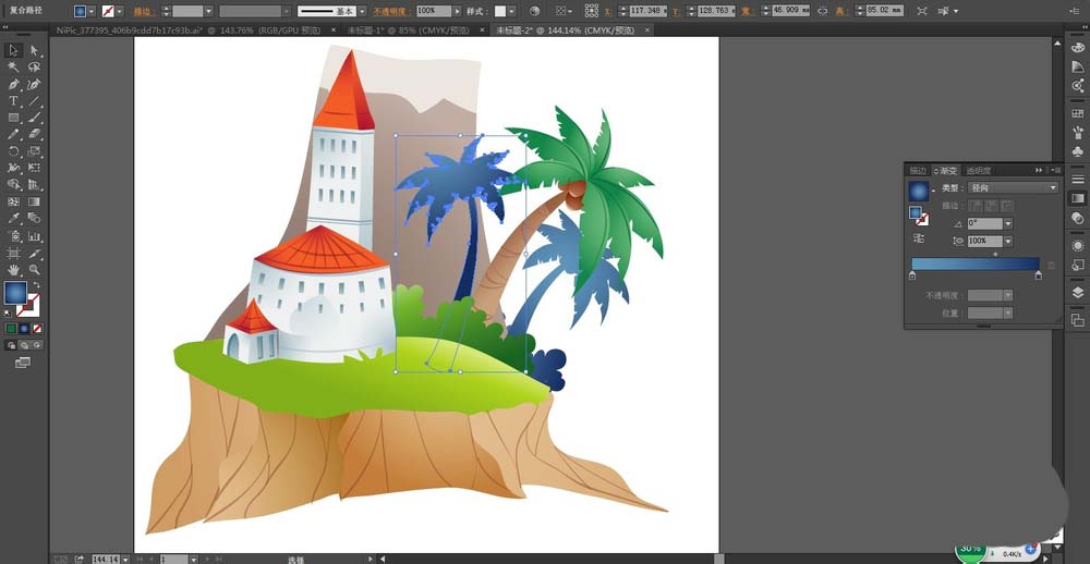 8、最后,我们再画出远处的椰子树的剪影,我们用蓝色的渐变填充放在后方,完成梦幻岛图片设计。