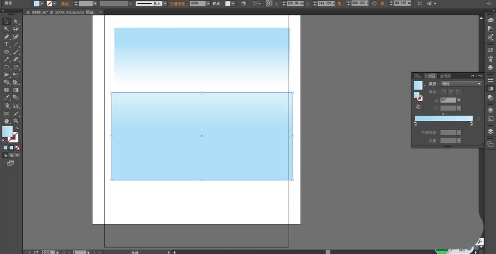 1、先用矩形工具画出背景上面的天空与大海的轮廓,我们分别用天蓝色的渐变填充这样的两个矩形,让其呈现海天一色的感觉。